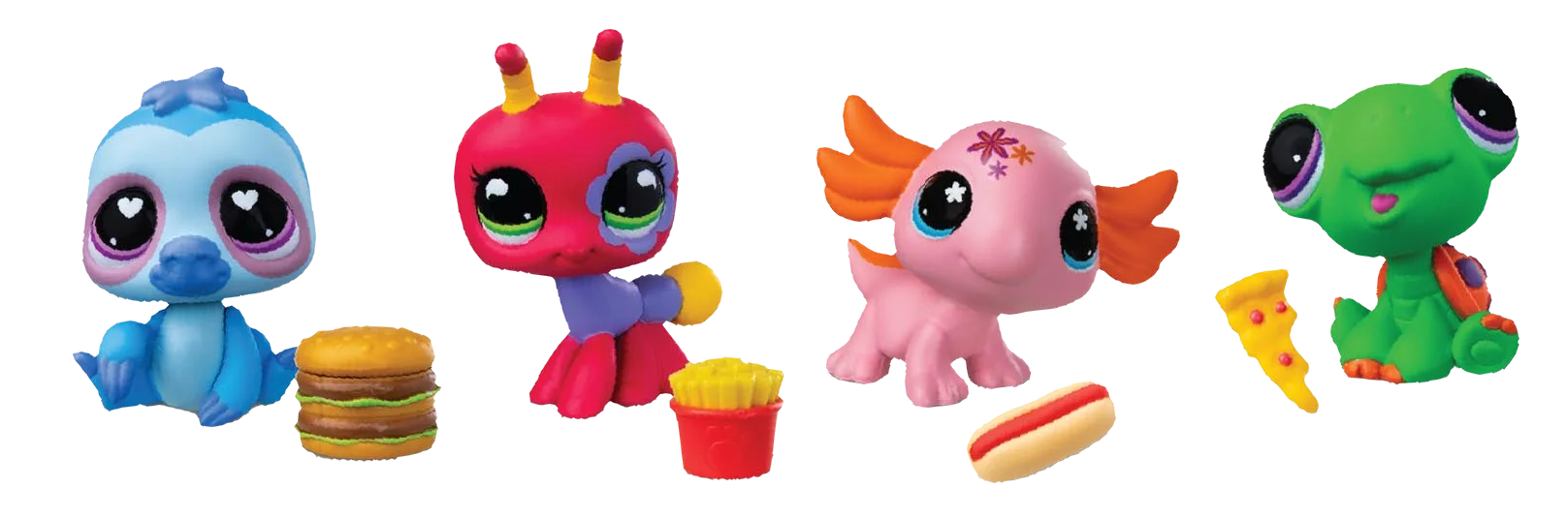 Blue Sloth, Red & Purple Ant, Pink & Orange Axolotl, Green Turtle